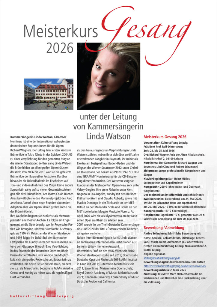 Eintritt: 20 €. Tickets in der Geschäftsstelle oder an der Abendkasse in der Oper, Telefon +49(0)341 30868933, E-Mail: gs@wagner-verband-leipzig.de, auch in der Musikalienhandlung Oelsner, Schillerstraße 5, 04109 Leipzig, Telefon +49(0)341 960 5656, E-Mail: musik@m-oelsner.de, oder an der Abendkasse